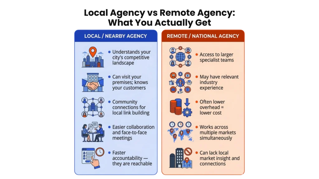 That said, proximity alone is never a qualification. A nearby agency that ranks well for their own city-level keywords, has relevant industry case studies, and runs a transparent process is a strong candidate. A nearby agency with none of those things is just conveniently located.