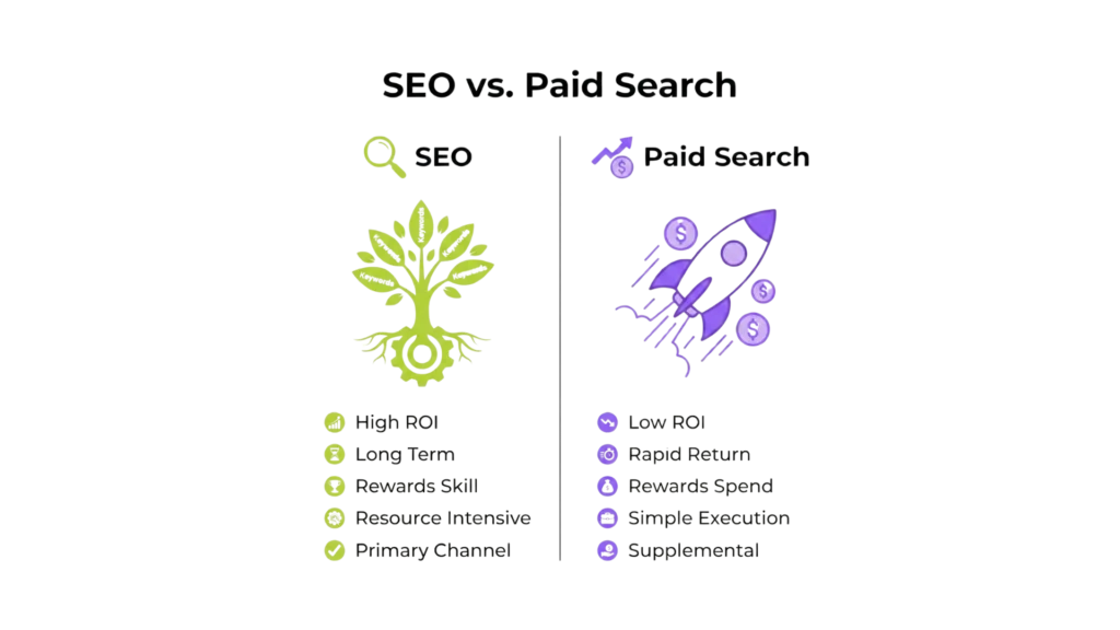 - SEO builds lasting value, while paid ads stop working when payments end